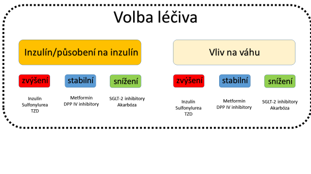 Když se podíváme na léky používané k léčbě diabetu, můžeme pozorovat jejich vliv na váhu (obr. 2).